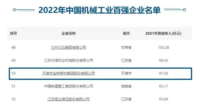 入圍前50! 天津金橋焊材集團上榜機械工程百強名單
