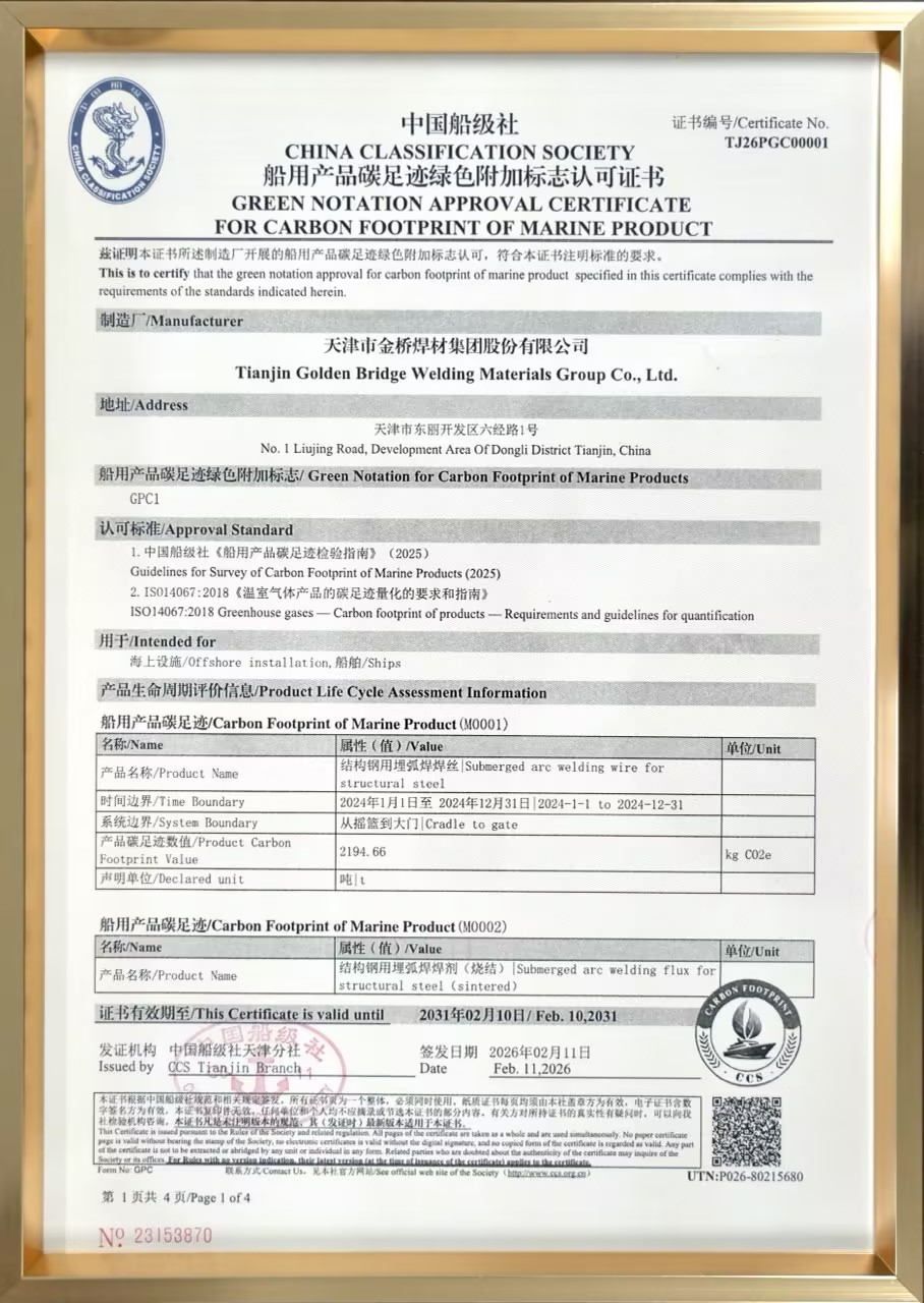 金橋焊材集團(tuán)榮獲國(guó)內(nèi)焊材行業(yè)首個(gè)船用產(chǎn)品碳足跡綠色附加標(biāo)志認(rèn)可證書(shū)